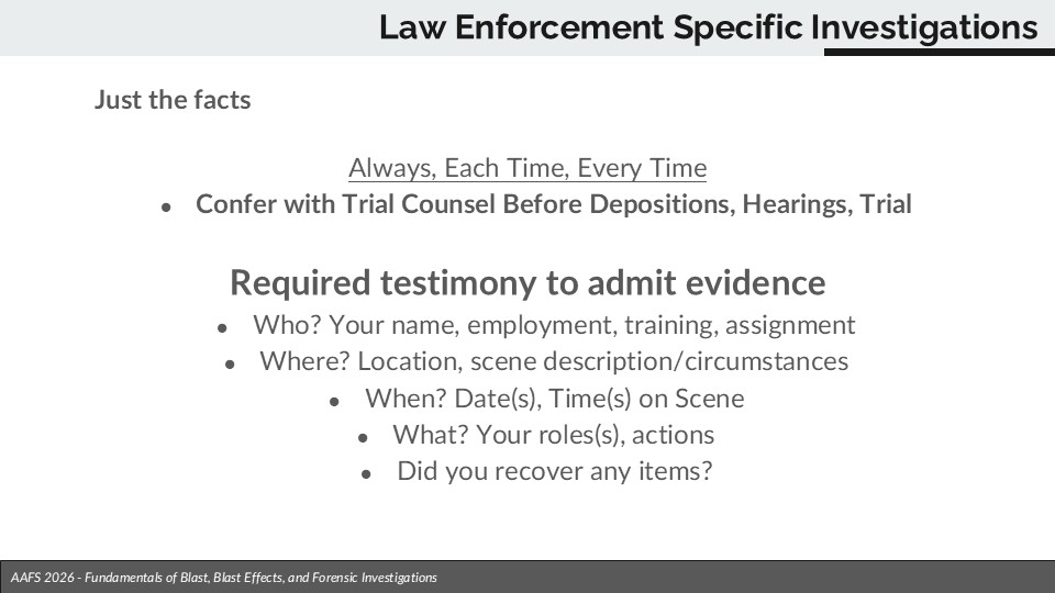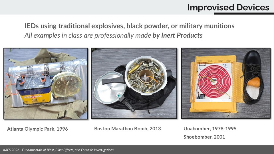 Together they put together four hours of well-received education for the American Academy of Forensic Scientists at their 2026 Annual Scientific Meeting, held this year in New Orleans, La. The Kemper Engineering team took advantage of the short drive time to the conference to bring a variety of realistic inert examples of pipe bombs, a suicide belt, and a number of notorious terrorist explosive devices, put together by the team at Inert Products. In order to help keep reference materials to open source, a variety of readily available guides were used as well as Bart’s paper regarding explosives and engineering in Iraq (2007) and in Afghanistan (2019), the latter including the world’s largest IED captured to date. Theya also presented various field techniques for gathering data as well a presented advanced modeling techniques.