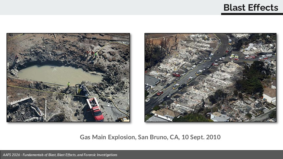Most explosions are not terrorist threats. The blast effects from a natural gas explosion is largely the same as other types of explosives, and documenting the results can be just as important as a criminal activity. Shows the 2010 gas main explosion in San Bruno, California.